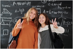 Two smiling students with backpacks in front of a math chalkboard in a classroom.