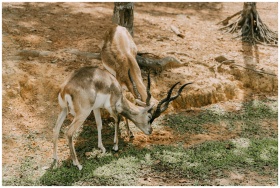 Two Blackbuck antelopes with spiraled horns grazing in a park setting.