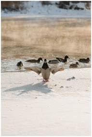 A group of ducks swimming in a partially frozen lake with a snowy shoreline during winter.