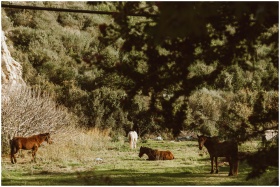 A serene countryside scene with horses grazing and