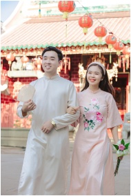 Smiling young couple in traditional attire enjoying a festive day outdoors with red lanterns.