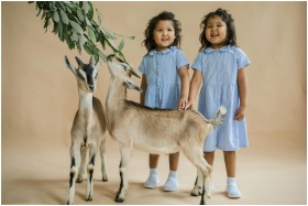 Charming studio portrait of twin girls in blue dresses with playful young goats.