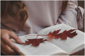 Cozy autumn scene with hands holding a book and maple leaves. Perfect for fall mood settings.