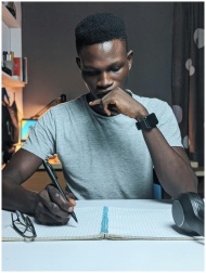 Man deeply focused while writing in a notebook on