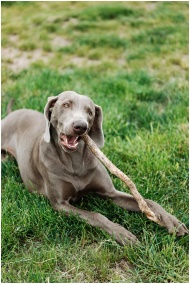 A playful gray dog chews on a stick while lying on