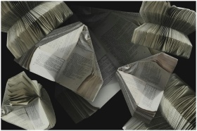 An abstract display of folded vintage books showcasing their pages and textures.