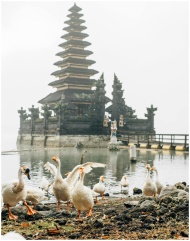 A flock of geese by a misty lake with a traditional temple in the backdrop, exuding tranquility.