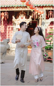 A couple in traditional Vietnamese ao dai walking together in a festive setting with lanterns.