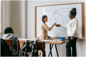 Engaging classroom scene with diverse students and teacher discussing a paramecium diagram.