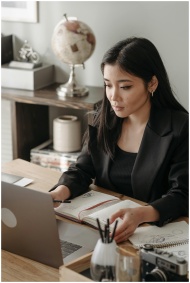 Asian woman in office attire focused on work at a desk with a laptop and notebook.
