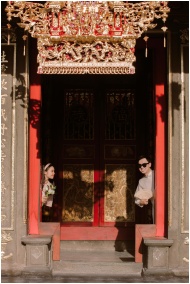 Two people peering from a traditional Asian temple