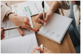 Close-up of hands writing in a notebook while studying documents on a wooden table.