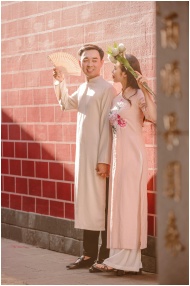 A couple in traditional Vietnamese attire pose cheerfully beside a vibrant red wall.