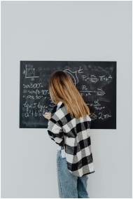 Teenager writing mathematical formulas on a blackb