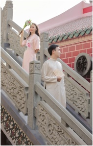 A couple playfully peeks from a traditional Chines