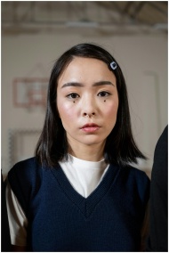 Close-up of a young woman with a bob haircut standing indoors, capturing a thoughtful expression.
