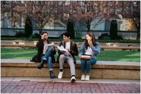 Group of college students laughing and studying outdoors on a campus bench during spring.