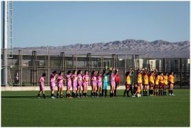 Women's soccer teams lineup on outdoor field with