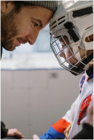A father encourages his young son before an ice hockey match, showing support and motivation.