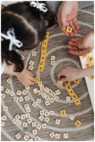 Family playing a word game with tiles on a pattern