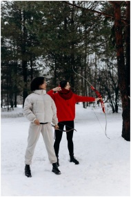 Two individuals practicing archery in a snowy fore
