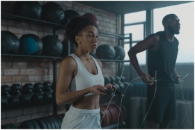 A man and woman in activewear using jump ropes for a workout in a gym setting.