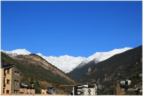 Stunning view of snow-capped mountains under a clear blue sky in La Massana, Andorra.