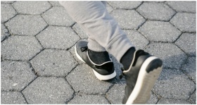 Jogger's feet in black sneakers moving on a paved urban street during the day.