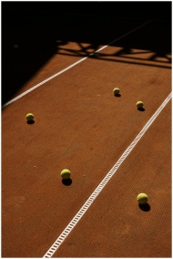 Tennis balls scattered on a sunlit clay court with shadows.