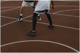 Two athletes intensely playing basketball outdoors
