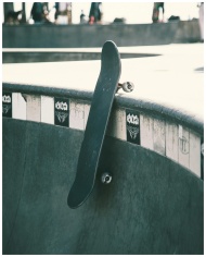 Close-up of a skateboard leaning against a skatepark ramp under daylight.