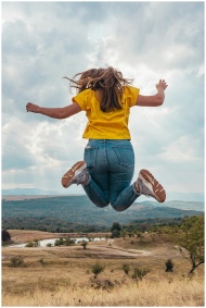 A woman in casual wear leaps joyfully in a scenic