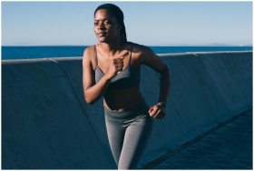 Healthy woman jogging along the oceanfront on a sunny day, embodying fitness and vitality.