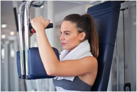 Young woman working out on a chest press machine in the gym, showing strength and determination.
