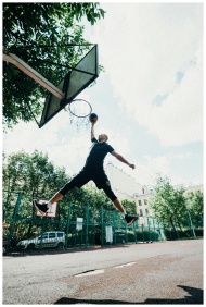 A skilled player performs a basketball dunk on an