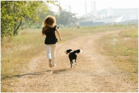 A woman jogging with her dog along a sunny path in a park, showcasing outdoor fitness and companionship.