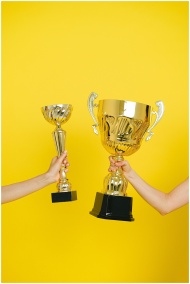 Two hands holding trophies against a vivid yellow backdrop, symbolizing success.