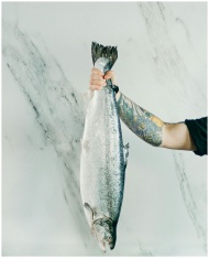 A tattooed arm holding a fresh fish against a marb