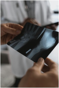 Close-up of hands holding an X-ray image in a medical environment with healthcare professionals.