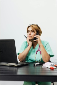 Doctor in green scrubs working remotely, using laptop and phone. Medical tools on table.
