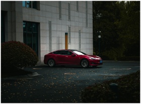 A sleek red electric car parked beside a modern building in an urban environment.