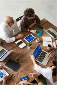 High angle view of a diverse team in a modern office setting discussing a business project.