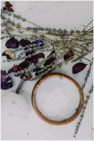 Flat lay of natural skincare products with lavende