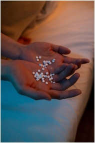 A person holding a handful of pills in a dimly lit bedroom, conveying themes of health and mental wellness.