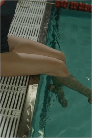 Close-up of a person dipping their legs into a swi