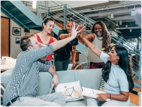 A multicultural office team high-fiving and celebrating a successful collaboration.