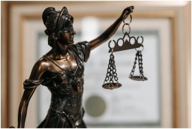 Close-up of a bronze Lady Justice statue holding scales in an office environment.