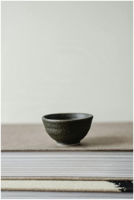A simple, elegant black ceramic bowl on a stack of books, capturing Japandi minimalism.