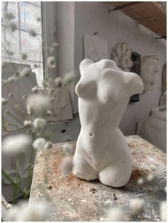 White clay sculpture of female torso placed on mes