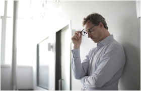 Thoughtful man in a bright room holding his glasses while leaning against a wall.